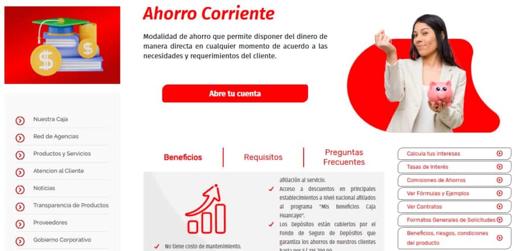 La Cuenta de Ahorro Corriente de Caja Huancayo es una modalidad financiera orientada a personas naturales que requieren liquidez inmediata. A través de este producto, el titular puede depositar y retirar fondos en el momento que lo considere conveniente, sin restricciones de plazo ni penalidades por disposición anticipada.